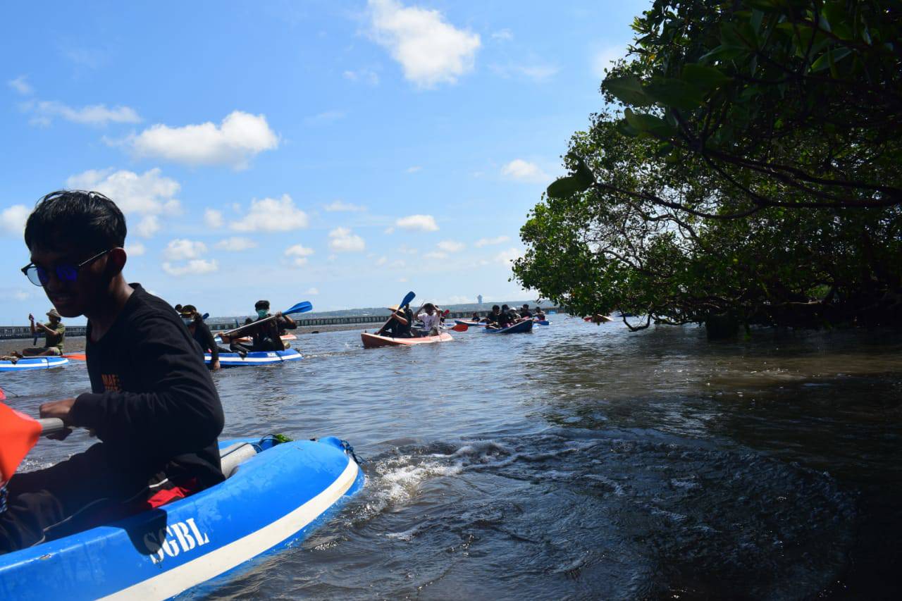 Selain penghijauan, para peserta juga menelusuri hutan mangrove dengan sebuah perahu kecil (kano) mencari sampah-sampah yang tersangkut di akar pohon bakau. “Ini kayak pengalaman baru buat adik-adik mahasiswa baru, mereka kan belum pernah mungut sampah sambil naik kano, jadi di samping pengalaman baru sekaligus menjadi pengetahuan baru bagi mereka, biota apa saja yang hidup di sekitaran hutan mangrove ini,” ucap I Gusti Ayu Agung Purnama Sari selaku ketua panitia.