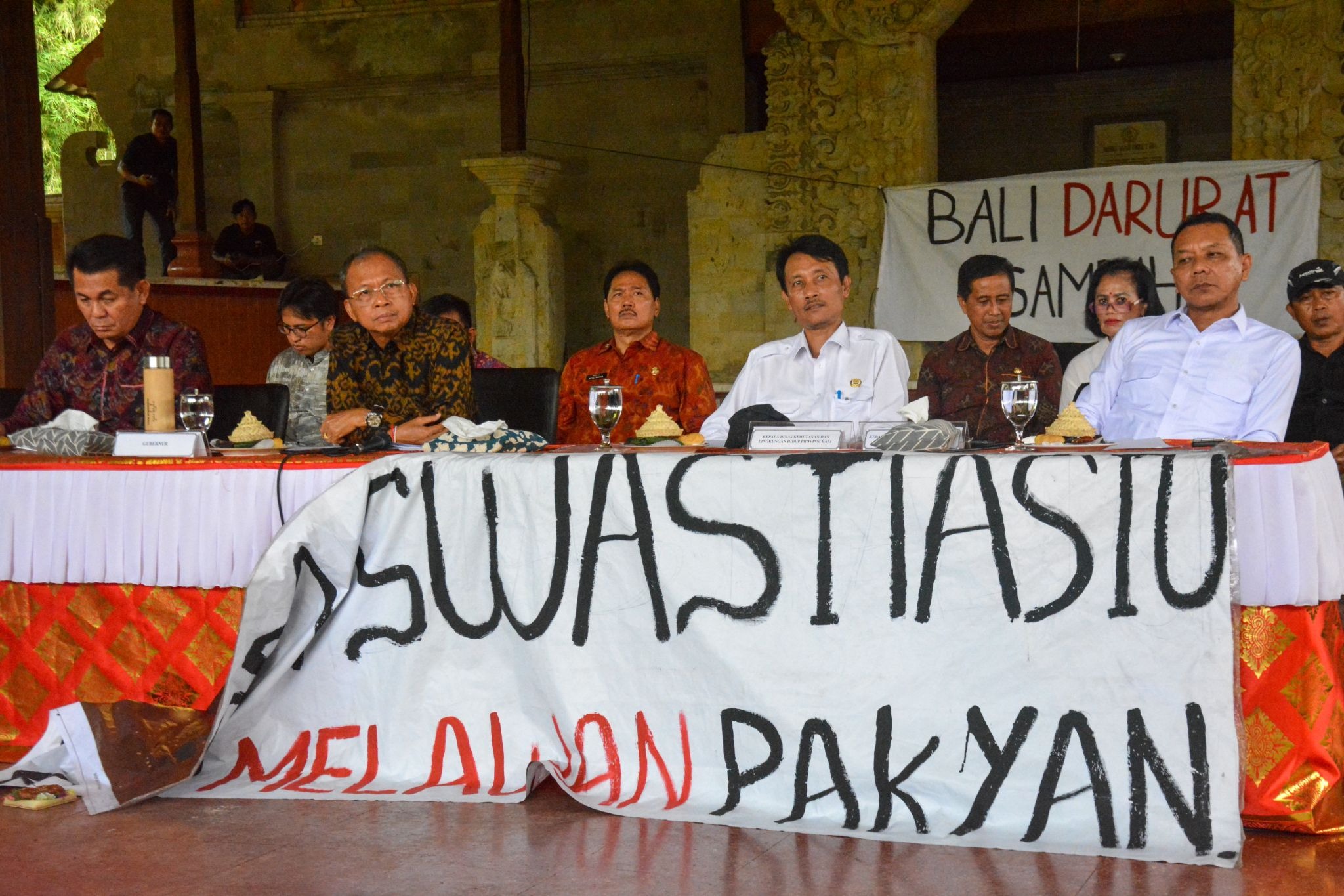 Sementara itu, sebuah spanduk bertuliskan “OM SWASTYASTU IZIN MELAWAN PAK YAN” sempat dicopot oleh petugas. Namun massa bersorak meminta agar poster tersebut tetap dipasang. Lalu spanduk tersebut akhirnya kembali dipasang dan tetap terpampang selama audiensi berlangsung.