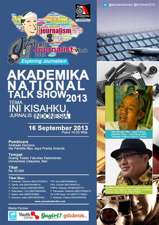 Akademika National Talkshow mengusung tema “Ini Kisahku, Jurnalis Indonesia” akan diselenggarakan pada Senin, 16 September 2013 pukul 14.00 WITA di Lantai 4 Ruang Teater Fakultas Kedokteran Universitas Udayana. Menghadirkan, Ida Pandita Mpu Jaya Prema Ananda (dahulu dikenal sebagai Putu Setia, redaktur senior Majalah Tempo) dan Andreas Harsono (salah satu pendiri Aliansi Jurnalis Independen, penulis buku Agama Saya Adalah Jurnalisme) sebagai pembicara. Talkshow ini terbuka untuk umum dengan tiket seharga Rp 30.000,00. Community exhibition akan dilaksanakan pada waktu dan tempat yang sama dengan Akademika National Talkshow, terbuka kesempatan bagi komunitas untuk menjadi peserta dalam acara ini.